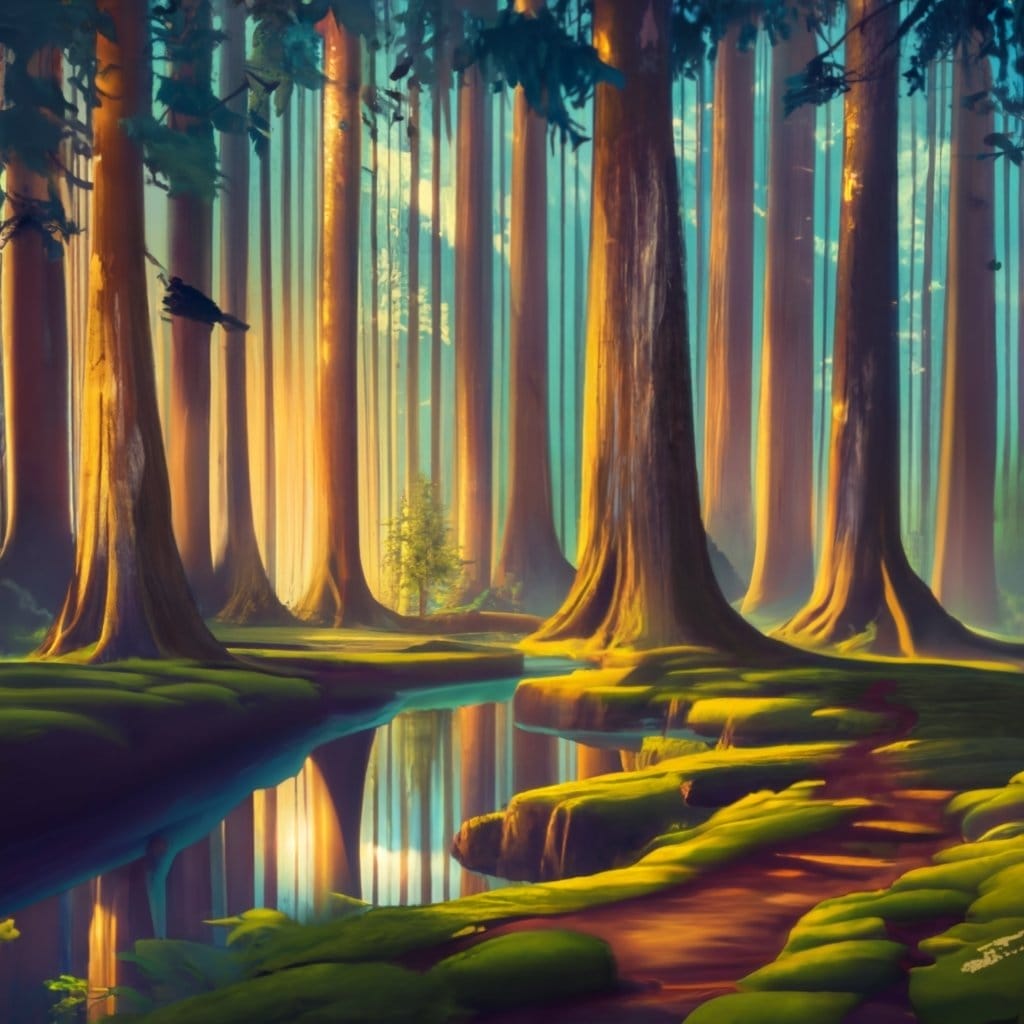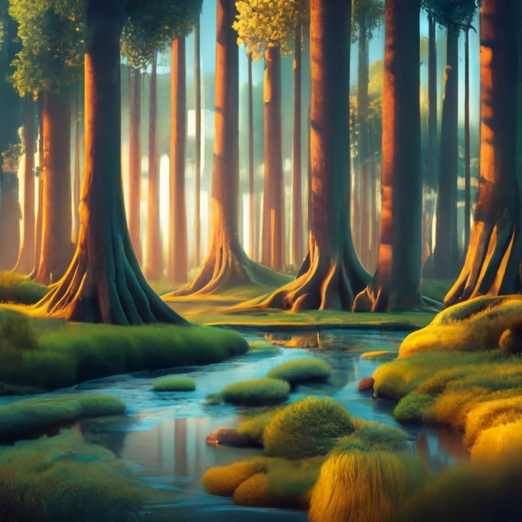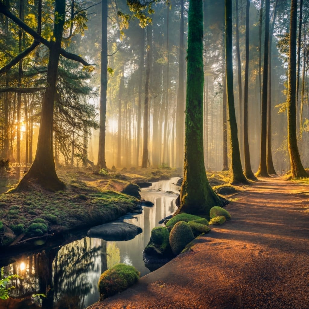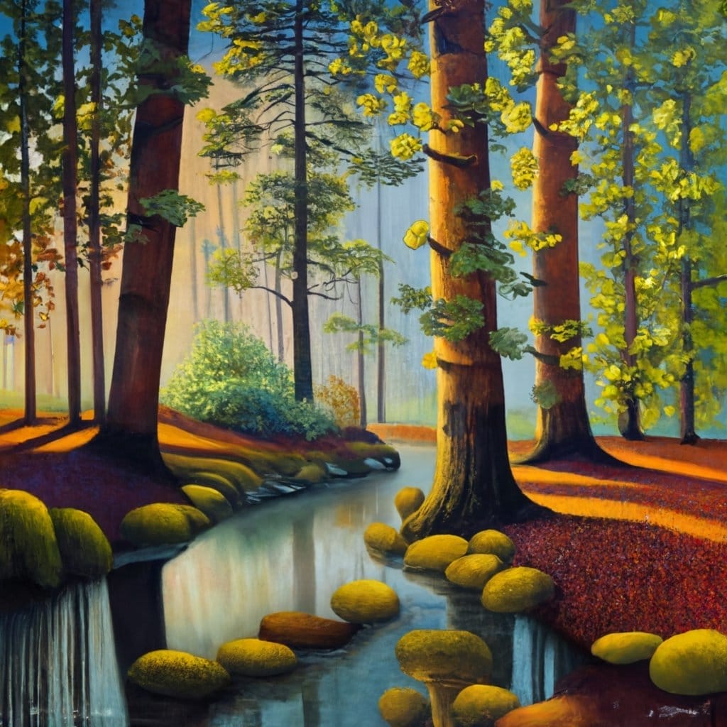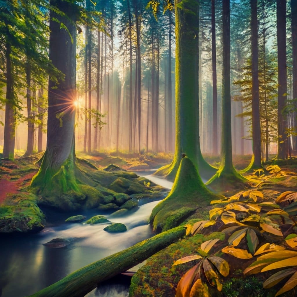 Oder nutze das Bild aus dem Beispiel oben: Ein mystischer Wald mit einem klaren Bach